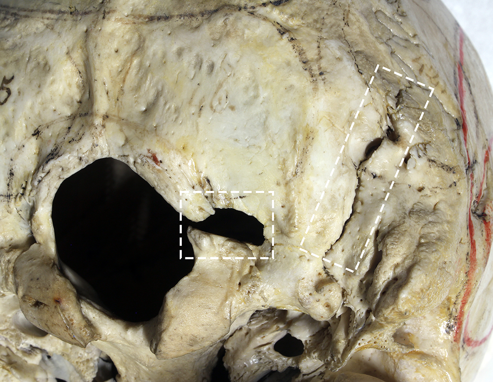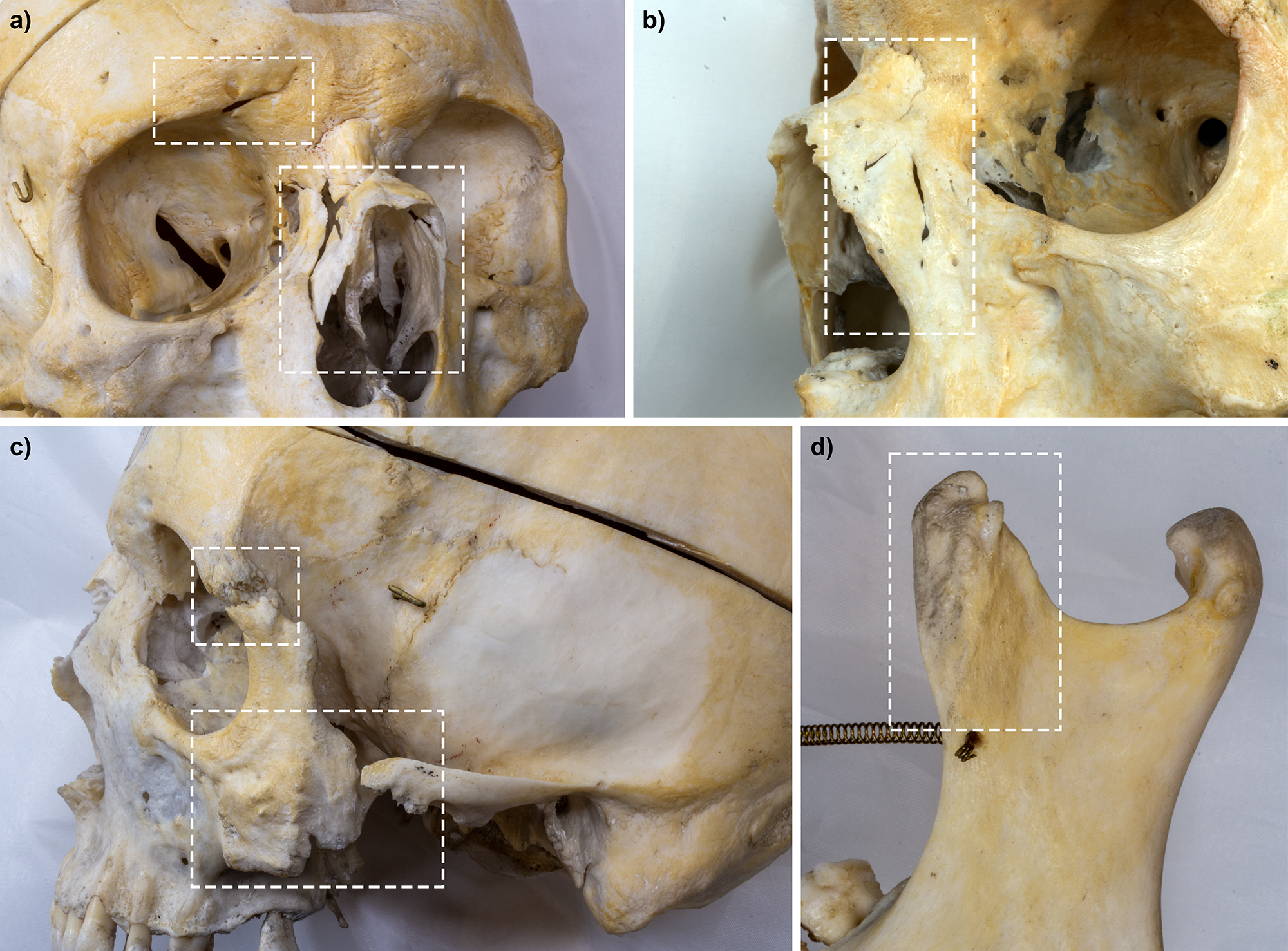 The remains are curated by the Division of Macroscopic and Clinical Anatomy at the Medical University of Graz, which is the successor institution to the former Anatomical Institute. The remains are exceptionally well-preserved, with the exception of the dentitions, which are very fragile and frequently damaged. This might be attributable to the maceration process (described in detail in an article published in the Archiv für Anatomie und Entwickelungsgeschichte), which involved soaking in warm water (up to 50°C) and degreasing in a gasoline solution, followed by cleaning with soap and water and sun-bleaching (Planer 1877). The skulls are marked with a number (typically a paper label affixed to the glabella) that corresponds to the register of the inventory of the former anatomical museum (when located at Harrachgasse 21). In some instances, the catalogue number (in addition to the paper label) was written in pencil on the skulls, primarily on an occipital condyle or on one of the mandibular ramii. Originally, the names of the individuals, their age at death, provenance (location of birth and death), and crime conviction were written in ink on the squama of the temporal bones, mostly on the left bone or on both. This writing was, for various undisclosed reasons, deliberately erased in the early 2000s from most of the skulls but could be partly or completely discerned in this study with the aid of an ultraviolet LED light torch (LUXNOVAC, 30 W at 365 nm). Through this method, it was possible to read partial or complete writings on 103 skulls.