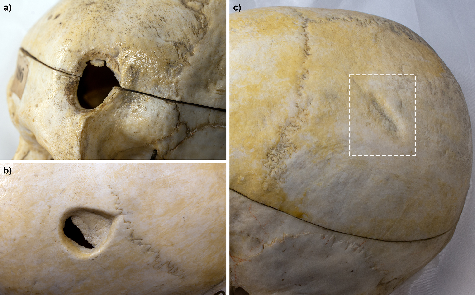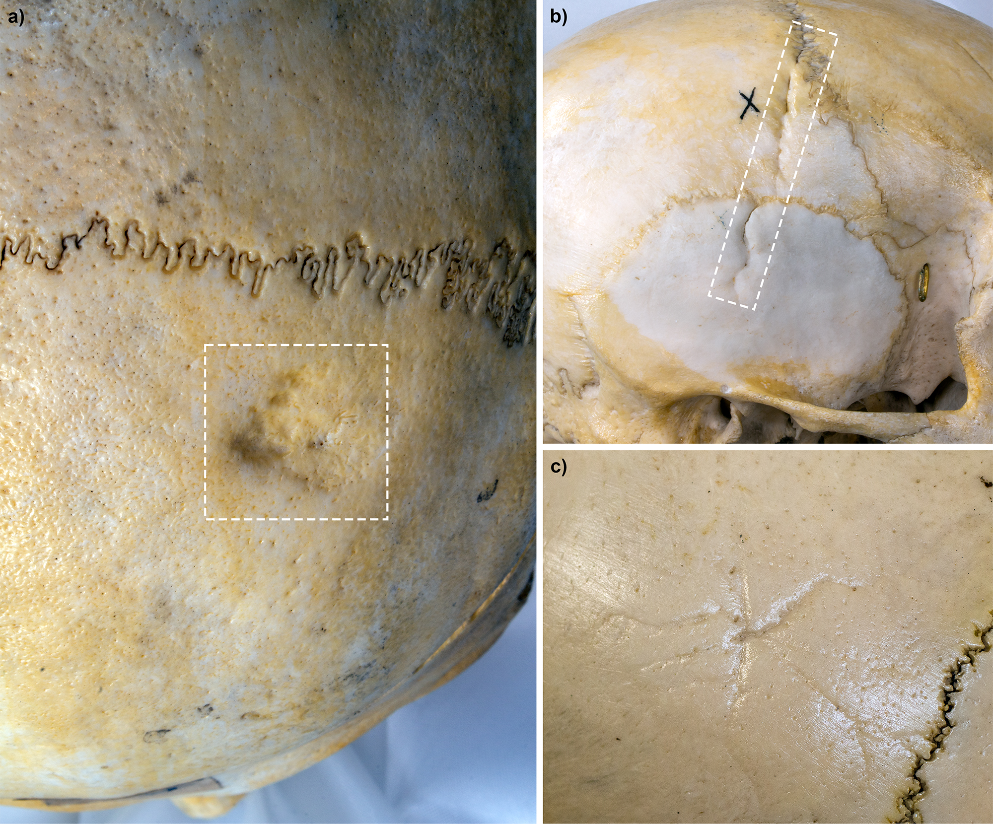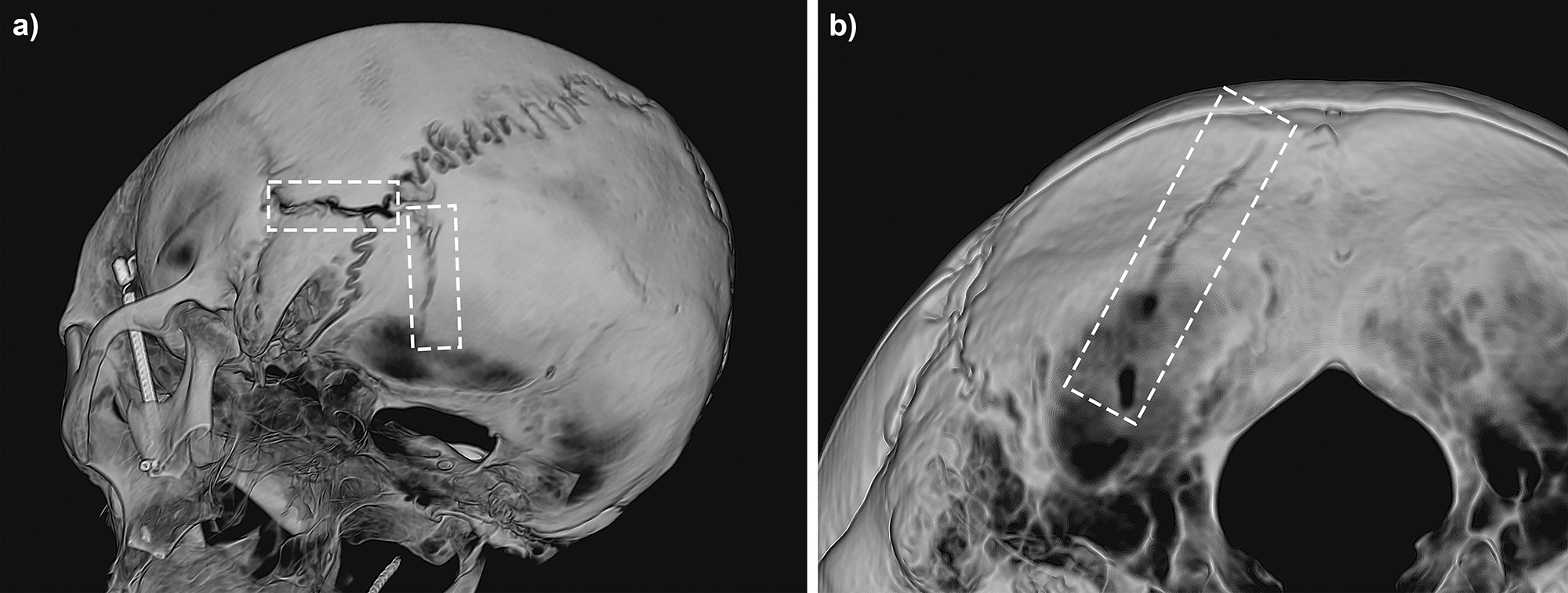 Head trauma (involving the whole skull) was recorded by location and type (Dedouit et al. 2024) and included both antemortem and perimortem injuries. Healed bony calluses on skulls in general tend to be small and are often difficult to discern, in contrast to postcranial elements (Cunha and Pinheiro 2009), and can easily be misdiagnosed from normal anatomical variation and potential alternative causes like dermoid cysts and infectious lesions (e.g., tuberculosis, treponemal disease). To avoid overdiagnosis, Botham (2019) proposed a more strict and standardized descriptive diagnostic protocol considering lesion margins, shape, size, location, and endocranial table involvement. Bone remodeling in well-healed lesions, however, often obscures these features, making descriptions difficult. In the current study, clear cases of depression fractures were only evident in lesions measuring more than 3 × 3 mm in size. As virtually all lesions were healed (see below), diagnosing and describing trauma was aided through computed tomography scans (Siemens Somatom Definition AS+, axial slice orientation, slice thickness 0.6 mm, no slice increment), which were processed and analyzed using Amira 3D (Thermo Fisher Scientific, v. 2024.1).
