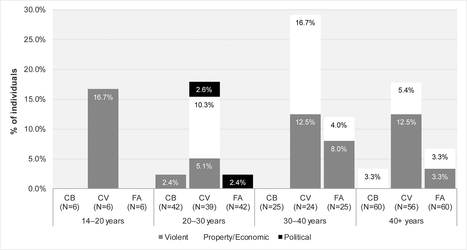 Following the definitions used at the time (Oberster Gerichts- und Cassationshof 1884:49–51), the individuals studied were convicted of 13 different categories of crimes (including attempts), which were classified into the three broad categories used by the Habsburg judicial system (K. K. Justiz-Ministerium 1852:Section XX): violent offenses (Gewaltthätige Handlungsweisse, e.g., murder, manslaughter, sexual crimes, arson), property/economic offenses (Gewinnsucht, e.g., theft, robbery, and fraud), and political crimes (Verbrechen politischer Natur, e.g., lèse-majesté, counterfeiting, and forgery). It was possible to assign a criminal offense category to 133 individuals in the present study. The convictions only refer to the last judicial sentence given to the individuals, however. From notes in the archival sources, it is evident that some prisoners were repeat offenders, but it has not been possible to trace the full criminal records for all individuals.